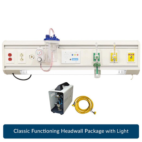 Available in a variety of value-added packages with simple installation and maintenance, Discover Headwalls serve as a cornerstone for any simulation or skills lab. Designed to simulate oxygen, air, and suction using a single air source, the Discover Headwall connects to an external Silent Air Compressor to provide realistic functionality.