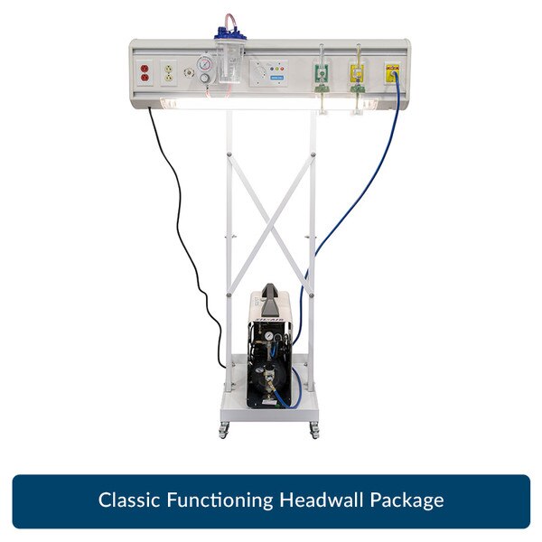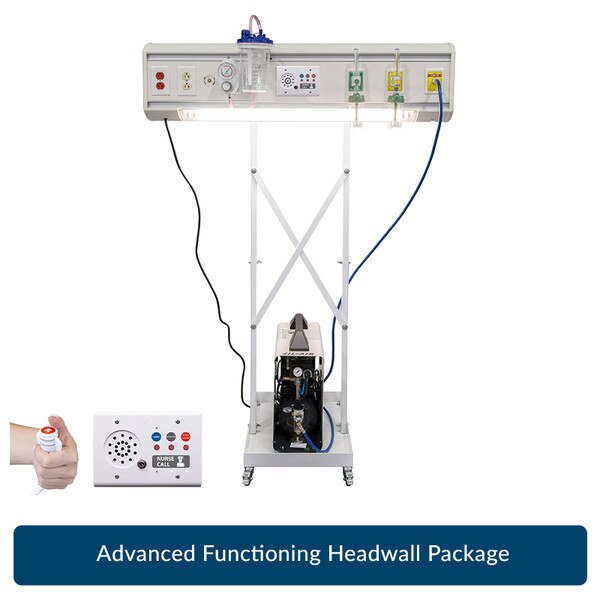 Available in a variety of value-added packages with simple installation and maintenance, Discover Headwalls serve as a cornerstone for any simulation or skills lab. Designed to simulate oxygen, air, and suction using a single air source, the Discover Headwall connects to an external Silent Air Compressor to provide realistic functionality. This package includes a mobile cart so that the headwall can easily be moved from room to room or bed to bed.