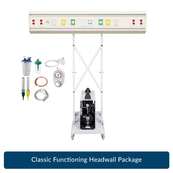 Available in a variety of value-added packages with simple installation and maintenance, Discover Headwalls serve as a cornerstone for any simulation or skills lab. Designed to simulate oxygen, air, and suction using a single air source, the Discover Headwall connects to an external Silent Air Compressor to provide realistic functionality. This package includes a mobile cart so that the headwall can easily be moved from room to room or bed to bed.
