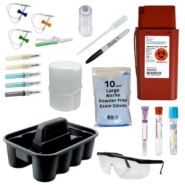 Contains all of the necessary suppplies to teach students how to correctly perform venipuncture and draw blood for diagnostic testing. Everything arrives neatly organized in a deluxe carry caddy with a portable sharps container for safe needle disposal.