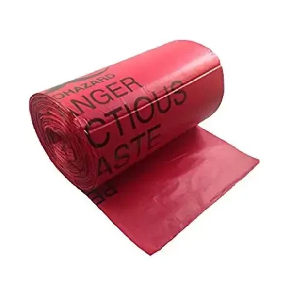 Red polyethylene bags printed with "Infectious Waste" and "Biohazard" in black.