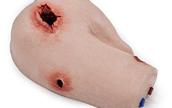- Shoulder Wound Packing Trainer from SimBodies contains a large internal vacity and a entry/exit through gunshots wound with internal bleeding tubes for simulated major hemorrhage