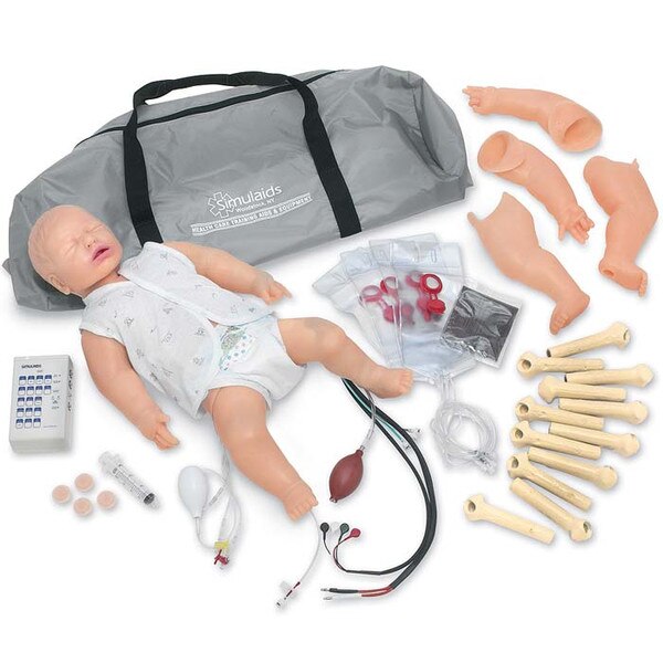 - STAT Baby Simulator from Simulaids features bilateral tension pneumothorax, female urinary catheterization, manual palpable pulses, and NG tube insertion with lavage and gavage