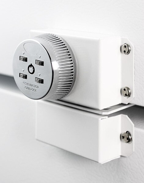 Factory-installed combination lock secures both refrigerator and freezer sections, with override key included