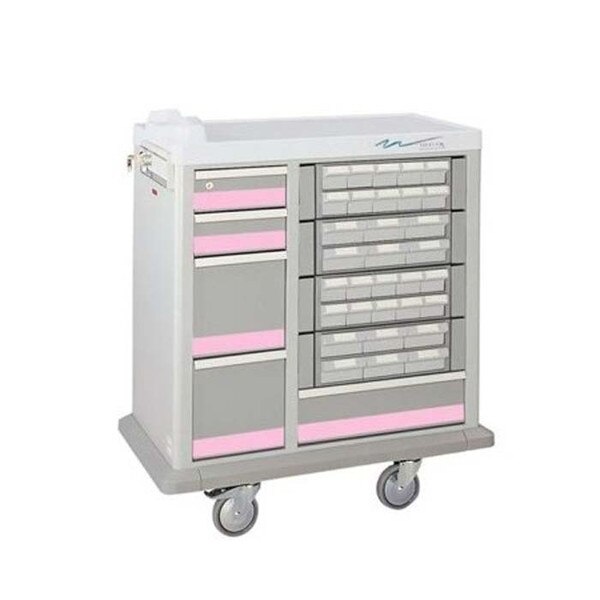 - Full Sized Steel Medication Cart from Waterloo includes pull-out shelf, key lock, 5 drawers and 4 cassettes that can hold up to 40 individual patient bins