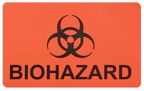 - BIOHAZARD printed in black, with biohazard symbol