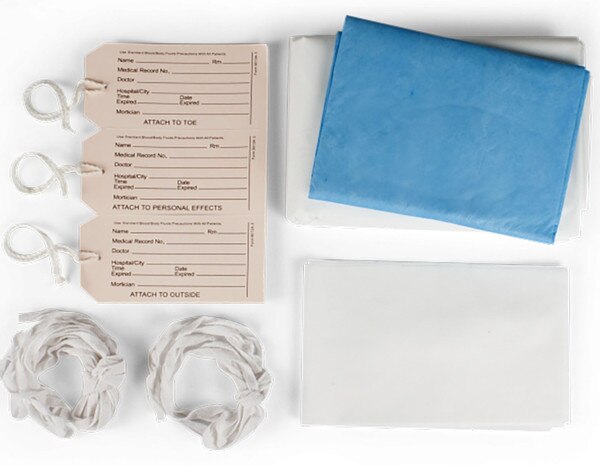 The Dynarex Shroud Kit provides a comprehensive solution for the respectful and sanitary handling of human remains. This kit includes a white opaque, water-resistant plastic shroud designed to retain fluids, ensuring hygiene and dignity. Each kit comes with a linen-like underpad for added protection, along with three toe tags with thread for proper identification. The kit also features a chin binder and multiple threads for secure closure and handling. All components are prepackaged in a heat-sealed polyethylene bag, which can be used to hold personal effects. Ideal for use in medical, mortuary, or emergency settings.